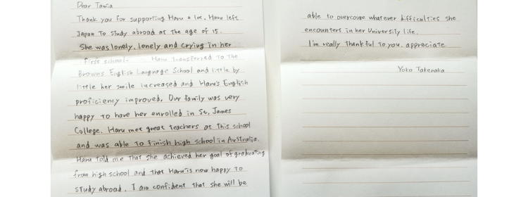 I’d like to share a lovely story of a Japanese student Haru Takenaka. She went to BROWNS English Language School (BROWNS) to study High School Preparation (HSP) and started Year 10 at St James College in 2020. COVID has impacted lots of students in many ways, and Haru was one of them. She suffered from homesickness and loneliness while studying hard under the pressure to enter a Japanese university. With joint effort, Haru did very well graduating from St James College this year and enrolled in a Japanese university successfully (I wrote a recommendation letter to support her university application)! Her family was very relieved and proud of her. I met Haru’s dad when he came and visited at the end of Term 3, 2022 and later Haru’s mum flew over from Japan to attend her Graduation Ceremony. I was thrilled to receive a handwritten letter from Mrs Takenaka. She doesn’t speak much English but tried her best to write me the letter, in which she expressed her gratitude for the support Haru received to complete her studies in Australia. What a touching story!